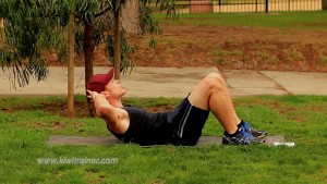 Start lying down, that lower back supported on the ground, and your abs just a little tight before you start. Be sure to open those elbows out nice and wide to focus the attention on your abs, and be gentle with those hands on the neck. I like to just place my fingertips on my head. You don’t want to pull yourself up by the neck; let your abs to all the work.