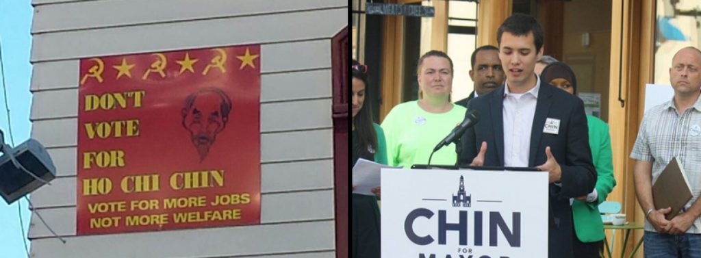 They signs were not officially produced by any mayoral candidate’s campaign, nor was Chin specifically mentioned. The sign itself is sort of pan-Asian-racist, given that the communist leader Ho Chi Minh is ethnically Vietnamese, which cannot be said of any of the mayoral candidates. These include Republican Macdonald, Republican Steve Morgan, Republican Luke Jensen, and Independent Charles Soule. But in a state that is overwhelmingly ethnically white (95%), Chin stands out as the only remotely Asian candidate running for office: he is half Chinese, second generation through his grandfather, and he came to Lewiston in order to attend Bates College.