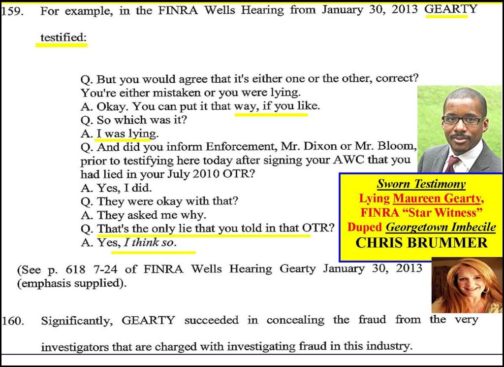 Played by a Queens NY bartender woman named MAUREEN GEARTY, Chris Brummer was duped like a fool by the Queens heavyset while she was a “witness” for a FINRA hearing headed by Brummer. Dazed with sex, fraud and money, the corrupt and moronic Chris Brummer “conveniently” left out Maureen Gearty’s admitted lies – presented by FINRA’s own enforcement staffer Jeffrey Bloom.