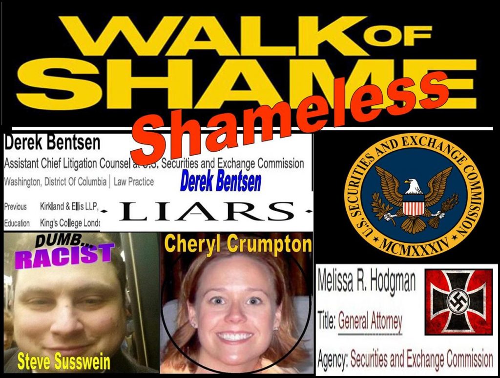 Since the SEC’s fake charges against Bill Uchimoto imploded, the porky faces of the SEC abusers are displayed in the media spotlight: MELISSA HODGMAN, DEREK BENTSEN, STEVEN SUSSWEIN, PATRICK FEENEY, CHERYL CRUMPTON, JOSHUA BRAUNSTEIN.