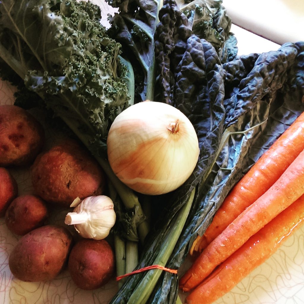 I’m not what most would consider a picky eater. I like Brussels sprouts, especially when roasted with bacon and butter, fresh beets (and fresh beats, too, now that you mention it!), mushrooms, squash of all types. But greens aren’t my favorite, especially when they’re cooked. So what to do with the kale in this week’s share? My first thought was to make kale chips in the oven. There are plenty of recipes out there. But there’s a mighty fine line between “crispy” and “burnt” for kale chips. So I changed gears, thanks to some inspiration from Epicurious. I punched kale and potatoes into the site’s recipe finder and got inspired by a few versions of kale and potato soup. The one that turned up was was a little heavy on the calories, so I searched a little more and settled on a recipe from Food & Wine. I added carrots because I traded with a friend — carrots from her garden for some of my hot peppers from Farmer Tom.